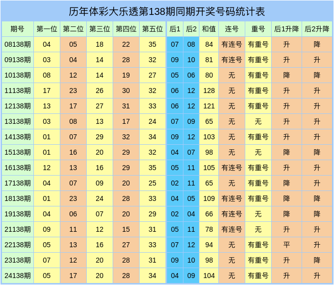 和值分析:在历史同时开奖中,前区和值出现范围在65-128之间,区间内的最大波动差值为63,其中大数和值开出频次较高,共出现了9次,刻下大数和值开出了9年,本年同时预测和值持续走小。