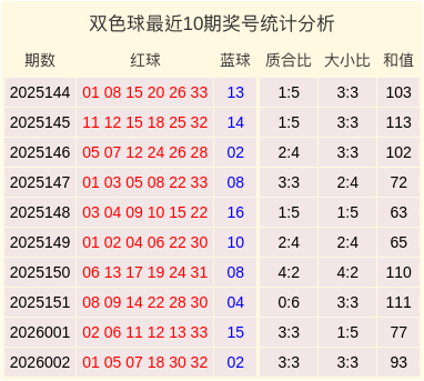 质合分析:上期红球质合比为3:3,最近10期红球号码质合比为20:40,合数出现的概率较高。本期瞻望合数出现的概率较高,保举质合比为1:5。
