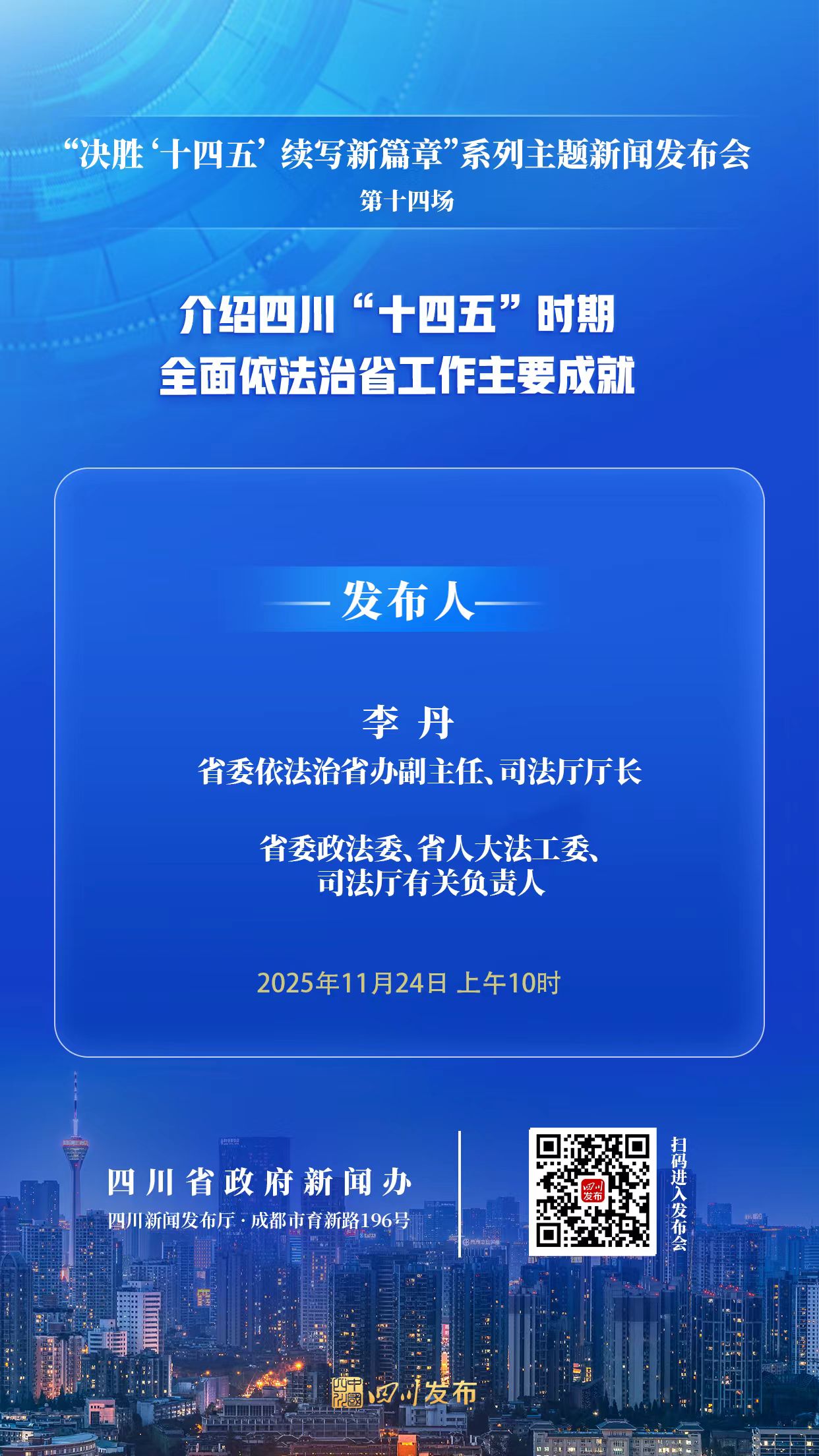 2025年11月24日(星期一)10:00,省政府新闻办将在四川新闻发布厅举行“决胜‘十四五’ 续写新篇章”系列主题新闻发布会第十四场天元证券-天元证券_正规配资开户_在线炒股杠杆官方,省委照章治省办副主任、国法厅厅长李丹围绕四川“十四五”技巧全面照章治省责任东要配置作先容并答记者问,省委政法委、省东说念主大法工委、国法厅干系认真东说念主参加答记者问。四川发布客户端将全程图文直播,敬请怜惜!