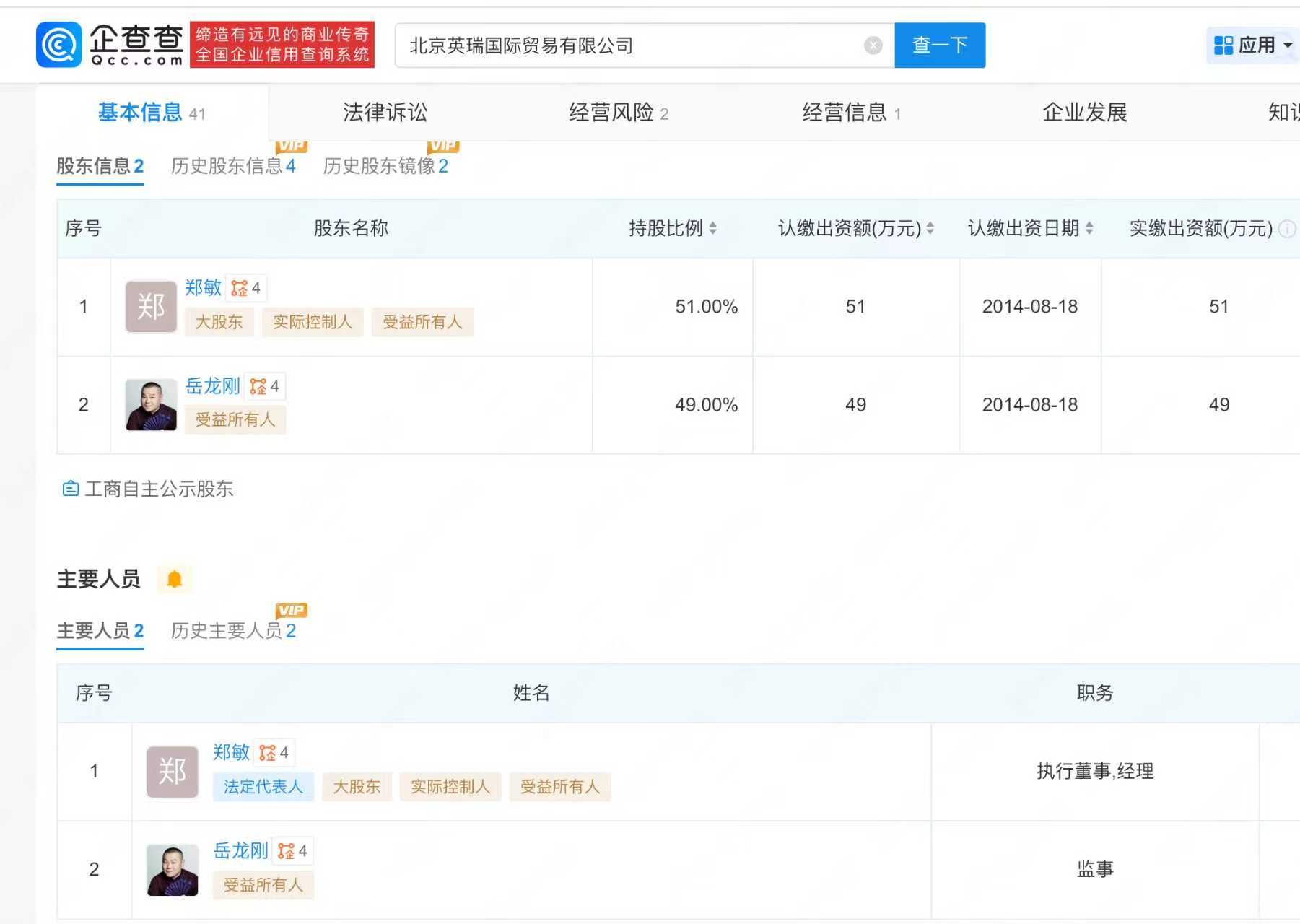 北京英瑞国际贸易有限公司成立于2014年,位于北京市石景山区,是一家以从事批发业为主的企业。岳云鹏真名岳龙刚,合手有该公司49%的股权,并担任公司监事。