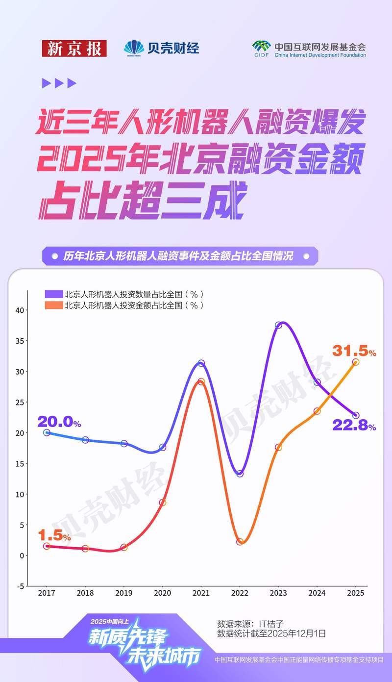 同期,近三年我国东谈主形机器东谈主融资明显加速。2023年以来,天下融资事件数与金额同步跃升,行业插足快速扩展周期,北京的融资说明尤为亮眼。IT桔子数据披露,铁心当今,2025年北京东谈主形机器东谈主融资事件达到37起、金额达70.12亿元,投资金额占天下比重高涨至31.5%,成本在向头部城市麇集。
