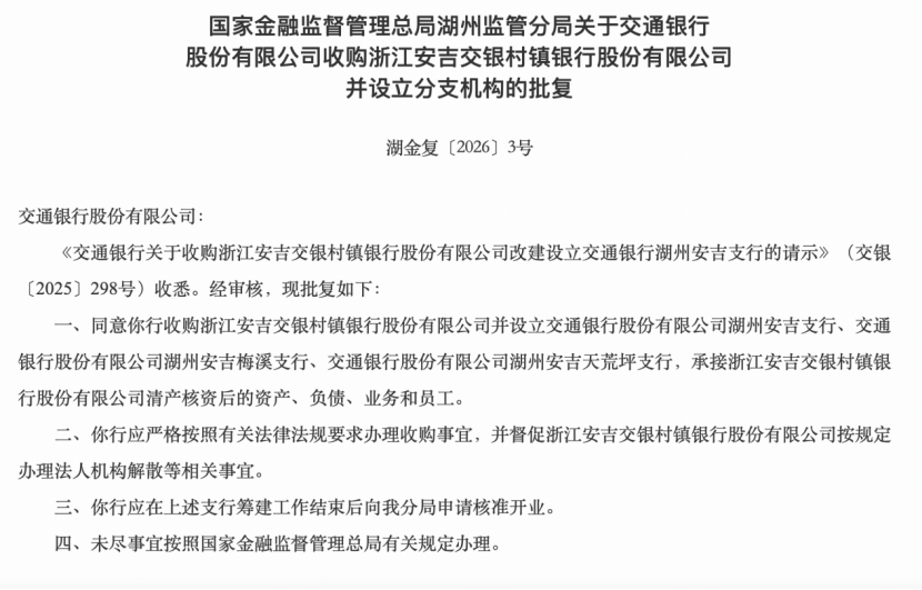 批复称,交行应严格按照关联法律律例条目办理收购事宜,并督促浙江安吉交银村镇银行股份有限公司按章程办理法东谈主机构终结等关连事宜。